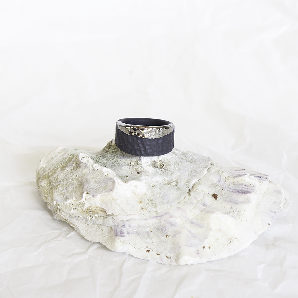 Įkvėptas kosmoso grožio, „Sidabrinio ūko žydėjimas“ porceliano žiedas derina dangišką eleganciją su moderniu minimalizmu. Rankų darbo iš puikaus juodo porceliano, padengto švelniu sidabro švytėjimu, jis perteikia paslaptingą tolimų galaktikų žavesį nesenstančia, nešiojama forma.